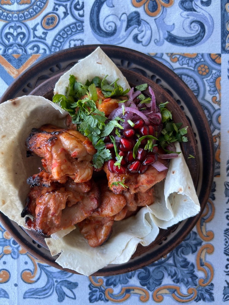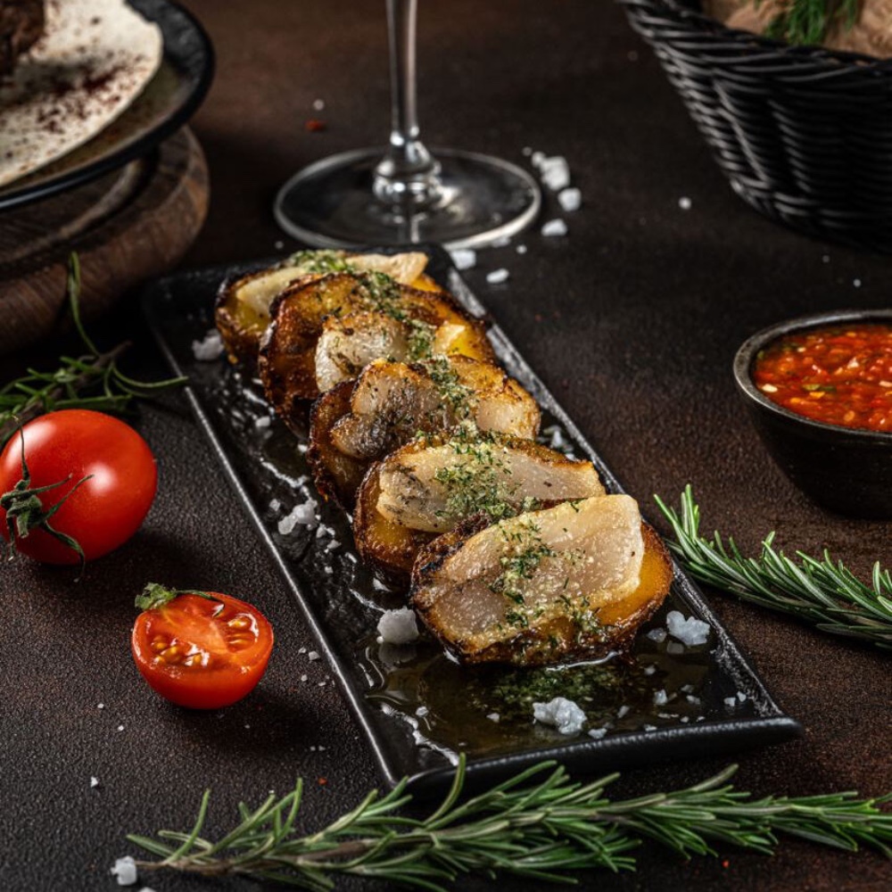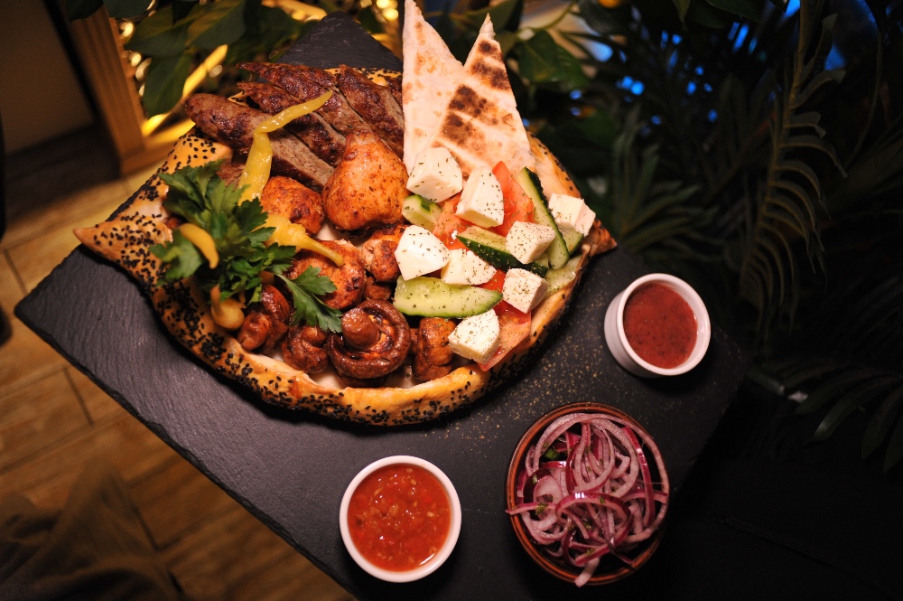 Курячий шашлик, кебаб з яловичини та свинини, шампіньйони гриль, фреш салат с бринзою та зеленню, лаваш з сулугуні, маринована цибуля, грузинський перець цицак, аджика.