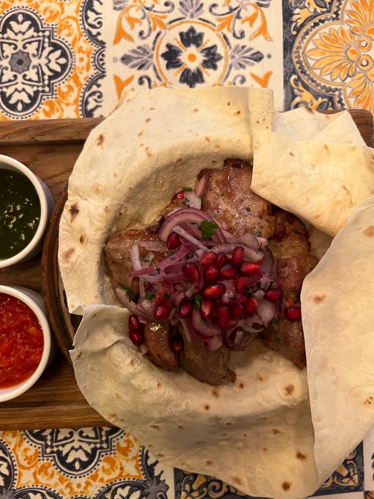 Шашлик з свиної вирізки, кебаб з курки, запечена картопля, фреш салат с бринзою та зеленню, лаваш з сулугуні, маринована цибуля, грузинський перець цицак, аджика.